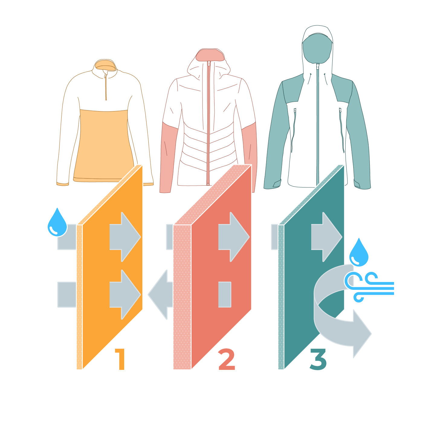 - couche externe : protection contre les éléments et évacuation de la transpiration vers l'extérieur
